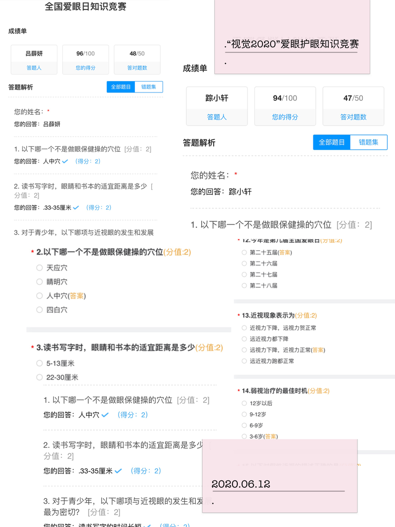 “视觉2020”爱眼护眼知识竞赛。竞赛6月12日开始,参赛同学们通过扫描参赛二维码进入相关试题的链接,限时10分钟,共50题。包括单项选择、多项选择、判断题三类题型,总分100分。其内容包括常见的眼部疾病、近视问题形成的主要原因,日常用眼卫生的注意点等等。经过十分钟的角逐,由工作人员根据后台统计成绩,最终决出一二三等奖选手。