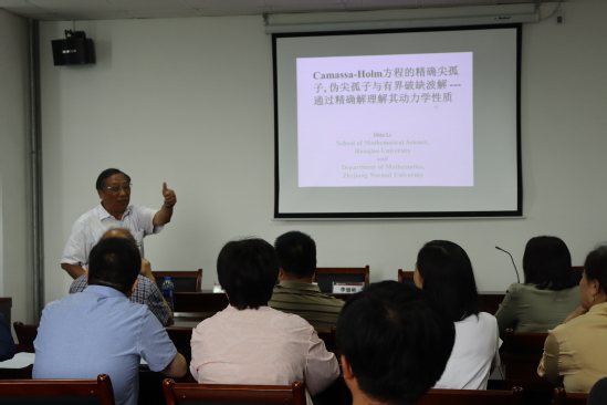 李继彬教授做了题为“Camassa-Holm方程的精确尖孤子, 伪尖孤子与有界破缺波解-- 通过精确解理解其动力学性质”的报告。李教授介绍了研究尖孤子, 伪尖孤子的一般性方法。他指出,国外很多学者研究此类问题时研究方法的错误导致了研究结论的错误,并由此勉励大家批判性的阅读国外文献。