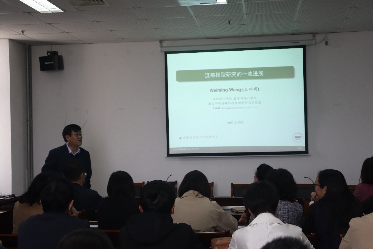 为推进工程研究中心(徐州市疫情防控及智能预警技术工程研究中心)的发展,4月12日,william威廉英国官网邀请淮阴师范公司王玮明教授,在敬业楼1501为全体教师作题为“流感模型研究的一些进展”的学术报告。会议由苏有慧经理主持。
