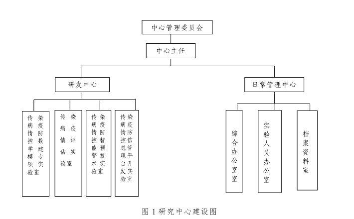 徐州市疫情防控及智能预警技术工程研究中心采用实验室主任负责制。包括研发中心(传染病疫情防控数学建模专项实验室、传染病疫情评估实验室、传染病疫情防控智能预警技术实验室、传染病疫情防控信息管理平台开发实验室等)、日常管理中心(综合办公室、实验人员办公室、档案资料室)等部门。工程研究中心建设如图1所示: