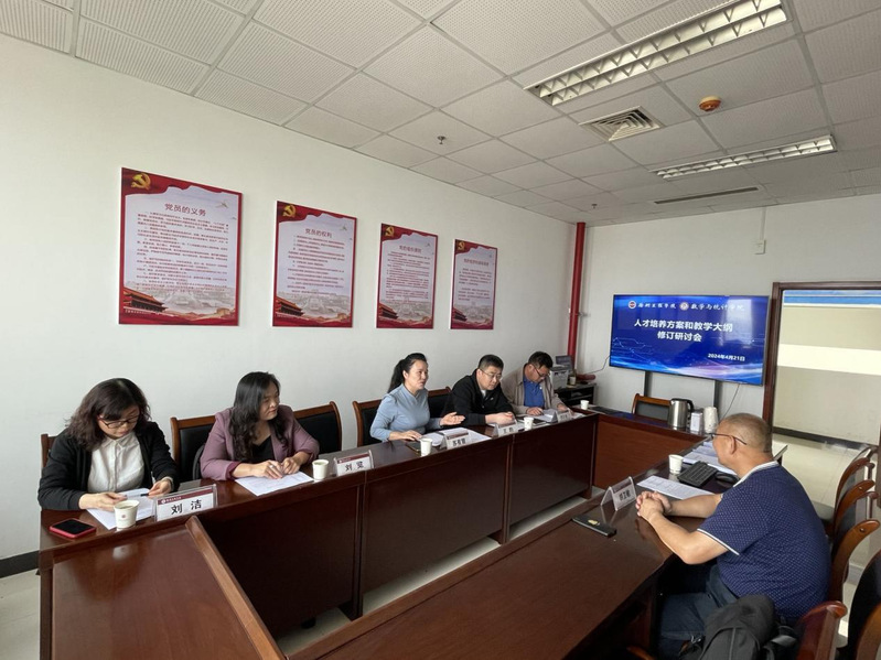 2024年4月21日,公司在敬业楼1504会议室召开“人才培养方案和教学大纲修订研讨会”。出席此次会议的有公司赵志超书记、苏有慧经理,以及信息与计算科学、应用统计学、数学与应用数学、高等数学四个教研室主任,并邀请了新疆伊犁师范大学应用数学研究所所长胡卫敏教授。会议由苏有慧经理主持。