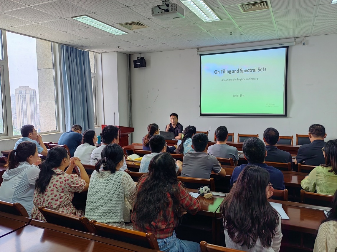 本次报告首先由周维祺博士介绍了Fuglede猜想目前的研究进展及其本人在该猜想上的一些相关工作,并同与会教师进行了热烈交流和讨论。Fuglede猜想是采样理论和加性组合领域的重要基本和前沿问题,对于推动调和分析理论以及数字信号处理应用的发展都具有很强的指导意义。