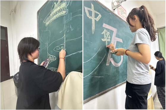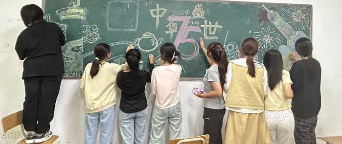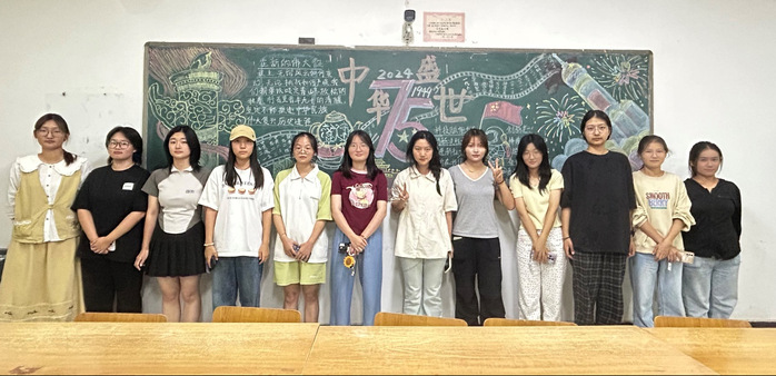承先人之光,深我辈之思想,为青年奋斗培根铸魂。同学们按照时间轴,深入了解新中国历史,从开国大典到改革开放再到新时代蓬勃发展,每一个重要事件都以绘画的形式保留在黑板之上,更生生烙印于每位同学的心中,每一个画面都凝聚着每位数统学子的拳拳爱国心。