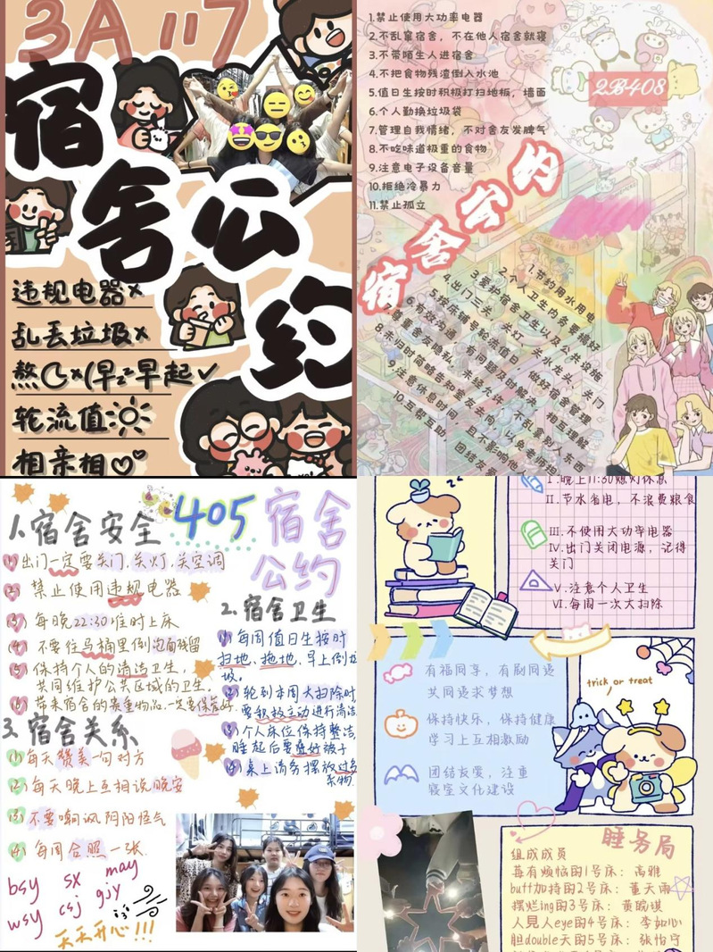 此次活动以宿舍为单位,旨在通过制定宿舍公约,加强员工之间的沟通与交流,增强宿舍的凝聚力和向心力,共同打造温馨、健康、和谐、友爱的宿舍生活环境。活动一经发布,受到了同学们的广泛关注,各寝室成员积极参与,通过集体讨论,围绕宿舍安全、卫生、作息、隐私等方面展开讨论。卡片制作过程中,同学们充分发挥自己的创意与想象力,通过手绘、电脑设计等多种方式,制作出一张张精美实用、各具特色的卡片作品。这些作品设计新颖、美观大方,不仅展现了同学们相互尊重、相互理解的良好品质,更传递出他们对于宿舍生活的热爱和向往。
