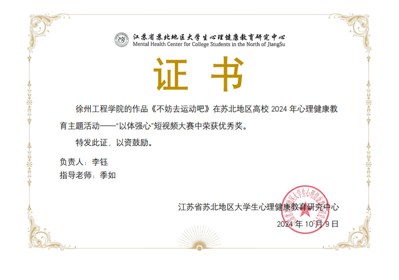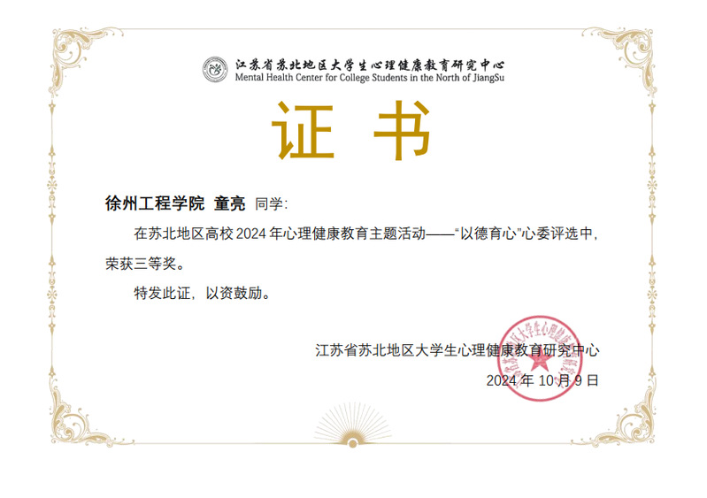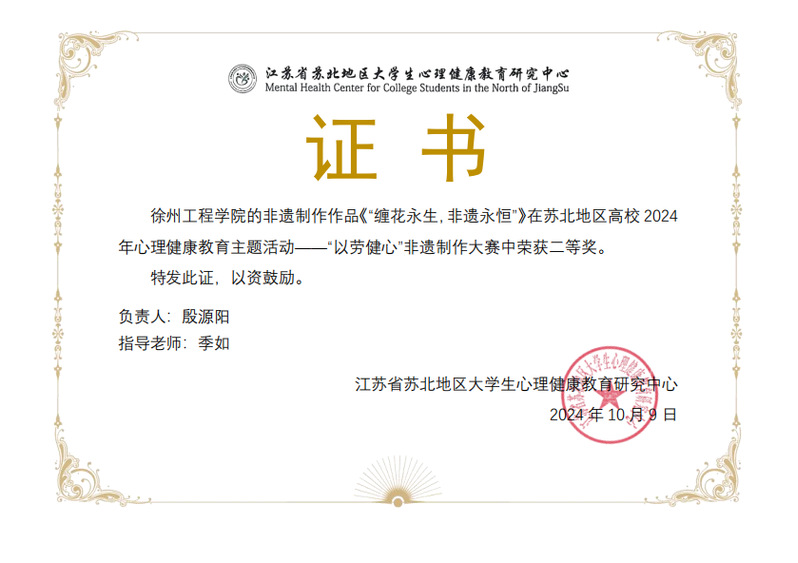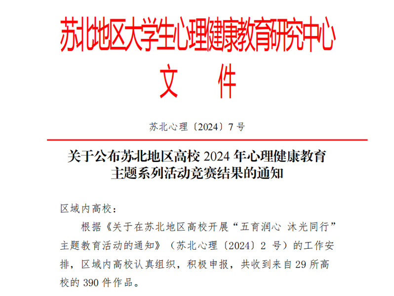 近日,苏北地区老员工心理健康教育研究中心公布了苏北地区高校2024年心理健康主题系列活动竞赛结果的通知。william威廉英国官网员工23统计班殷源阳同学荣获“以劳健心”非遗制作比赛二等奖、22信计嵌1班童亮同学荣获“以德育心”心委评选比赛三等奖、22统计嵌班李钰同学荣获“以体强心”短视频比赛优秀奖。